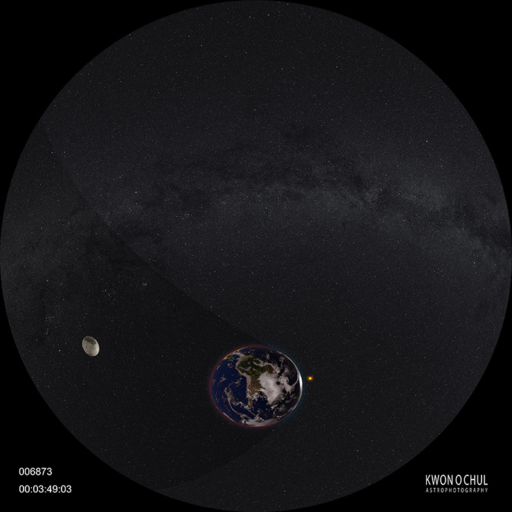 Even with the Moon totally eclipsed, it is still visible, glowing red. Sunlight passing through our atmosphere is still able to reach the Moon, but only the red light. Blue light is scattered by our atmosphere, but longer red wavelengths are bent into the shadow. We are seeing the Moon lit by all the sunrises and sunsets around our planet. This scene is taken at Lyaylik, Uzbekistan on August 7, 2017 by Kwon O-Chul, Jeong ByoungJun.