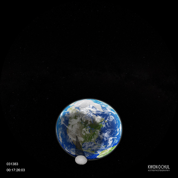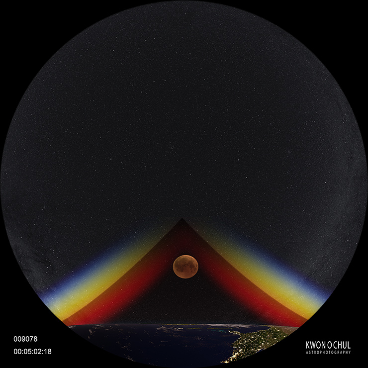 This is a computer graphic video that explains why the moon in the shadow of the Earth looks red during a total lunar eclipse. Here, the moon used footage from an actual total lunar eclipse.