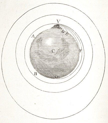 人工衛星の原理を最初に思いついたのは、科学者のアイザック・ニュートンです。彼は高い山の上から大砲を撃つことを想像しました。大砲の弾は遠くまで飛んで行ってから落ちます。地球の重力に引っ張られるからです。もっと速い速度で発射したら、もっと遠くまで飛んで行ってから落ちるでしょう。ニュートンは、大気圏の外のような空気抵抗のない場所で速い速度で発射すれば、地球の周りを回り続けることができると考えました。